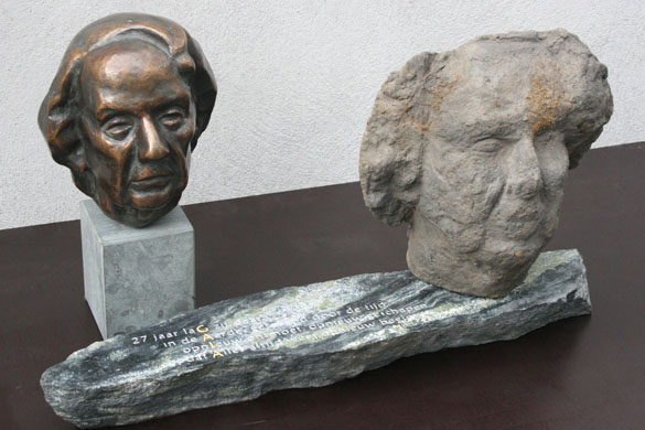 Portretteren is mijn passie. In 1985 maakte ik mijn eerste portret, van mijn toenmalige 68-jarige buurvrouw, 27 jaar later zit zij nogmaals model. Dit portret gaat in brons. De opstelling van beide portretten hierboven te zien heet Gaia. Gaia betekent ‘Aarde’ / ‘Oermoeder’. Het voorste portret is van aluminiumcement en heeft 27 jaar ‘vergeten’ in de aarde gelegen. Een bijzonder verhaal van een bijzondere dame. Het hele verhaal verteld in een 7 pagina’s tellend boekje kan besteld worden.